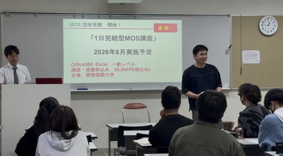 2026年2月5日(木)、学内で「1日完結型MOS講座」を開講しました。当日は留学生を含む8名の学生が受講し、本試験「Microsoft Office Specialist(MOS)Excel 365」に全員合格を達成しました。