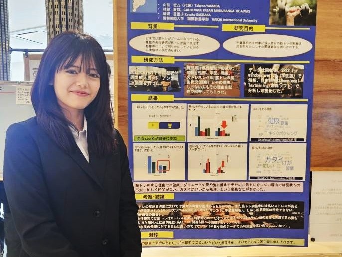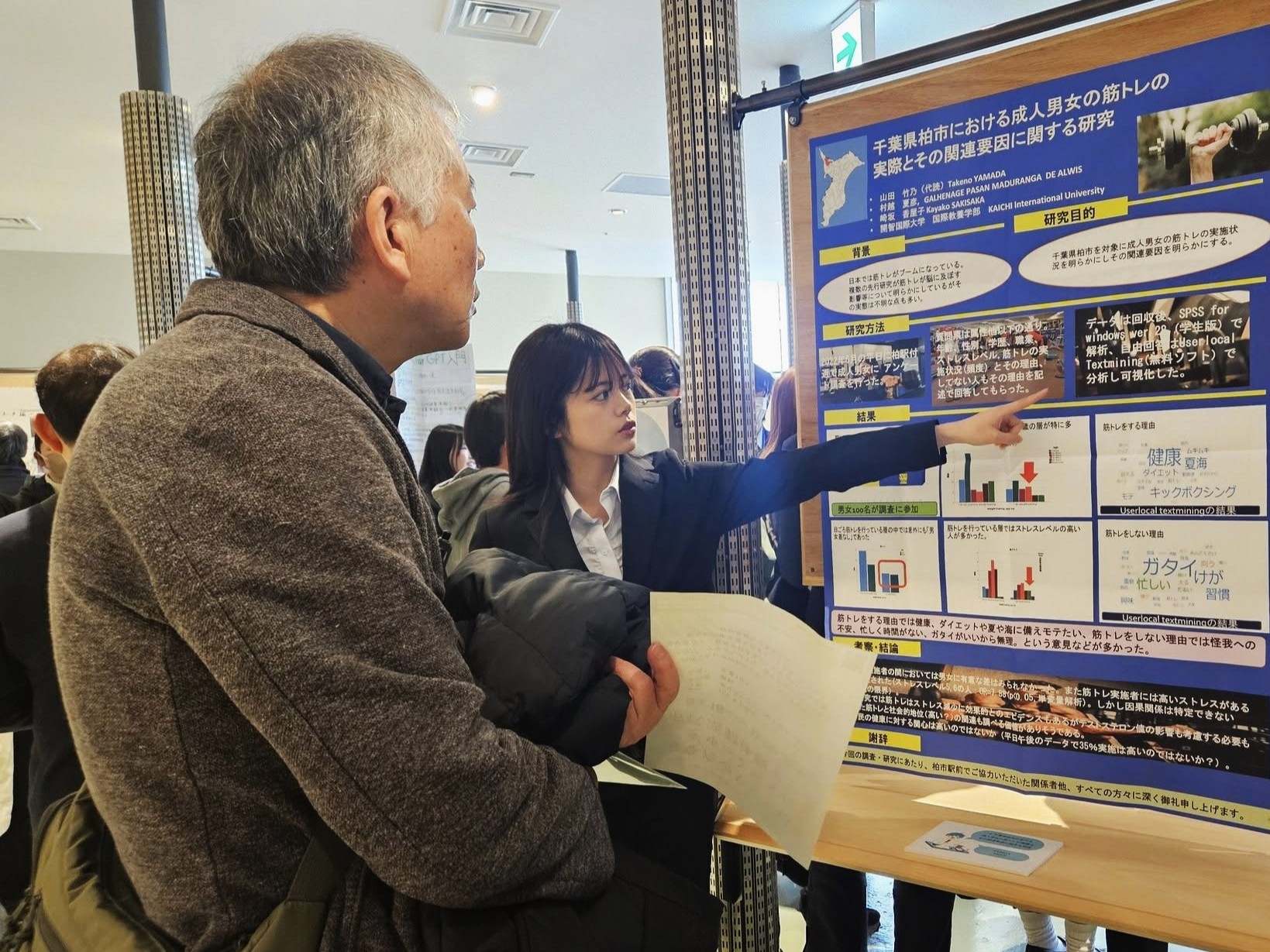本イベントは、柏市役所の都市部中心市街地整備課や柏アーバンデザインセンター(UDC2)の「柏駅周辺の再開発計画に若者の声を」という働きかけで開催されました。本学からも国際教養学部3年の山田竹乃さんが参加し、柏駅東口のダブルデッキで調査した「柏市における成人男女の筋トレの実際と関連要因に関する研究」についてポスター発表を行いました。地域連携センター長の崎坂香屋子教授(国際教養学部)、同運営委員の竹内裕一教授(教育学部)も参加しました。開智望中等教育学校などからの発表も多数あり、活気あふれる催しとなりました。